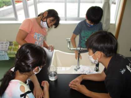 水のかさをつかって0.5は0.01何個分かを調べました。