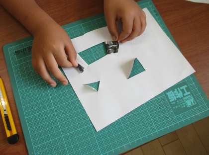 何度か簡単な線を切った後、これから図工で取り組んでいく「まどからこんにちは」で使えるように、まどの作り方を練習しました。