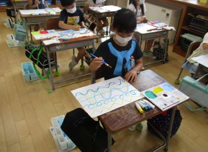 図画工作科の学習で初めて水彩セットを使いました。筆洗いバケツやパレットの使い方に気をつけながら、いろいろな波を描きました。大波や小波、波しぶきなどいろいろな波を想像しながら楽しそうに描いていました。