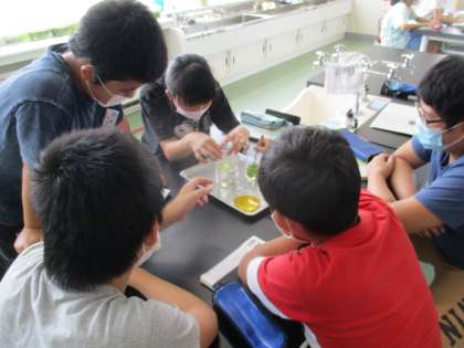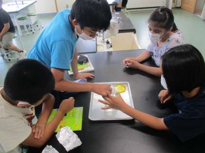 理科では、「植物のからだのはたらき」について学習しています。今日は、葉に日光を当てるとでんぷんができるかどうかの実験をしました。エタノールで葉の色を脱色し、ヨウ素液に付けて色が青紫色になるかを調べました。なかなかうまく結果を見ることができなかった班もありましたが、子供たちは班ごとに役割を決めて、手際よく実験していました。