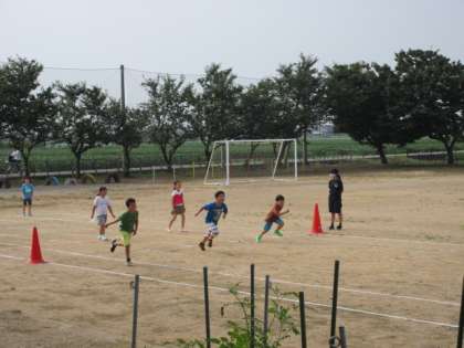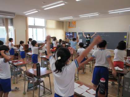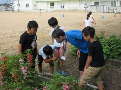 朝のグラウンドが密にならないように、ラジオ体操をする学年と走る学年に分かれて活動しています。走り終えた3年生が、育てているオクラに何かを発見!理科専科の先生に尋ねています。