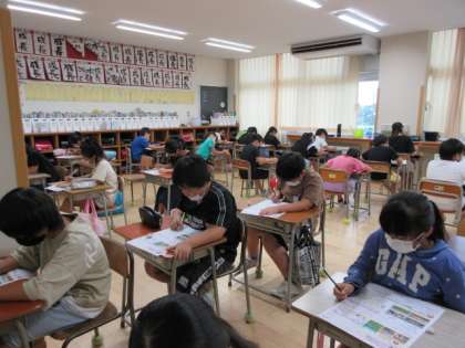 我が国の食料生産について学んだことを確認中。しーんと静まりかえった教室で集中して取り組んでいます。