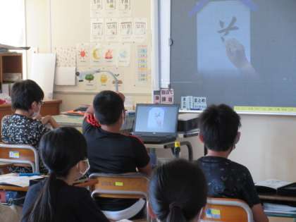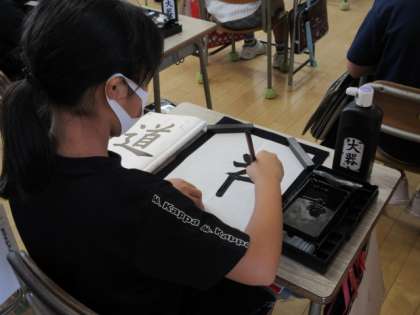 動画でポイントを確認し、筆のもちかたにも気を付けながら、一画一画ていねいに書いています。