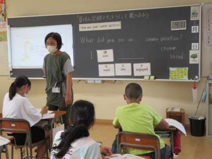 夏休みの思い出を紹介し合うための「わたしのせりふ」を英文で書いています。I went to ○○.