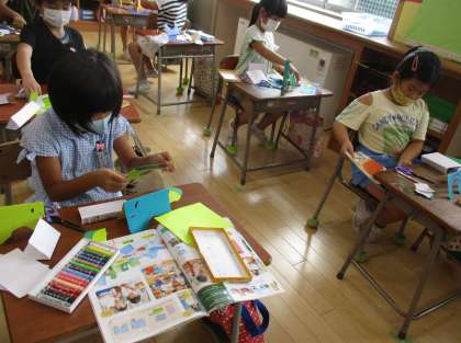 1年生 図工 公開日 2020/09/09 更新日 2020/09/09 1年 「おって たてたら」の学習をしました。紙を折ると立たせることができたので、その形からロケットやトンネル等いろいろな形に見立てていきました。作った後には、グループの友達と楽しそうに動かしながら見せ合っていました。