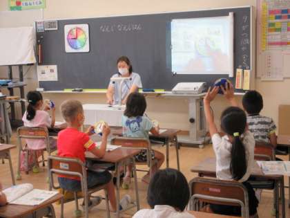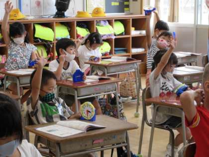 1年生 算数 公開日 2020/09/10 更新日 2020/09/10 1年 模型の時計を使いながら、「なんじ なんじはん」の学習をしています。時計の針を進めながら、自分の生活と結びつけて時刻を読んでいます。