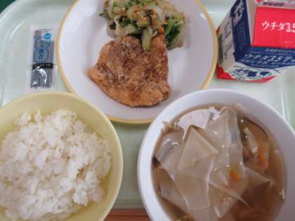 豚肉の竜田揚げ いり大豆和え ワンタンスープ