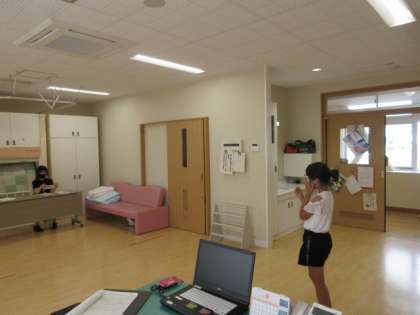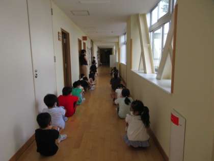 廊下に静かに並んで順番を待っています。一人ずつ自分のハンカチで片目を押さえ、視力を測定しています。ゲーム等に夢中になって目を酷使していないか、結果をもとに確認しましょう。