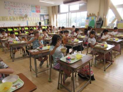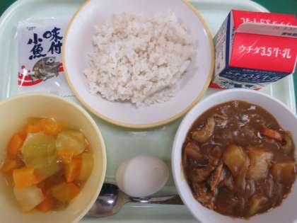 今日の給食 公開日 2020/09/17 更新日 2020/09/17 給食室から 麦ごはん カレーライス ゆで卵 フルーツゼリーミックス 味付け小魚 子供たちの人気メニュー1位のカレーライスに、1年生も大喜びです。