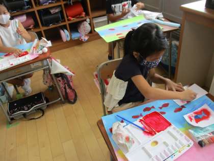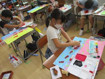 子供たちは、色の濃さや、たんぽを押す力加減などを工夫しながら取り組んでいました。完成が楽しみです。