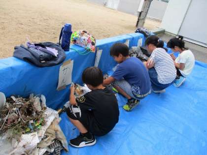 地球環境問題をテーマに、調べ活動に取り組んでいる4年生。あるグループが校長室へたずねてきました。何とかしたいという思いが伝わってきて、アドバイスをしたところ、その日がらすぐに通学路のゴミひろいを始めました。まずは、ゴミを拾い、分別して現状を調べています。