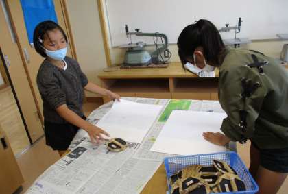 6年生は、国語科で学習した「やまなし」の情景をスチレン版画で表しています。今日は、川の様子を刷りました。スチレンボードにフォークやペットボトルキャップで傷をつけ、色を工夫して思い思いに刷ることができました。