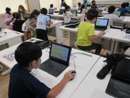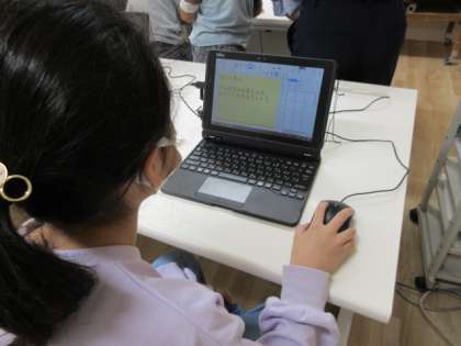 町探検で見つけたことを発表するための資料をコンピュータを使って作成中です。クイズ形式で紹介しようと、ソフトキーボードで文字を入力しています。上手にイラストを貼り付けている子もいました。