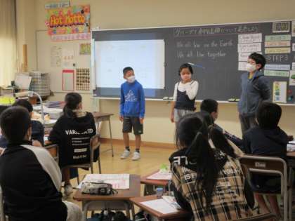 6年生 外国語 公開日 2020/10/08 更新日 2020/10/08 6年 We all live on the Earth.地球に暮らす生き物について考え、そのつながりを発表しています。グループで考えた食物連鎖についての発表です。1学期よりも上手に話すことができていて、成長を感じました。