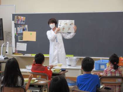 下学年の教室で、学校栄養職員さんから「正しいはしのもちかた」の話を聞き、一人一人きちんともつことができているか見てもらいました。