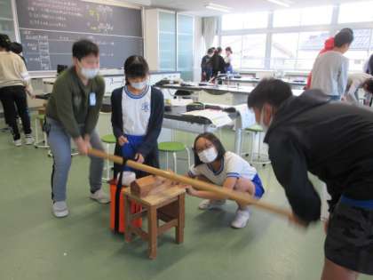 てこのはたらき。実験をしながら手応えを感じつつ、力点、作用点、支点の学習中。