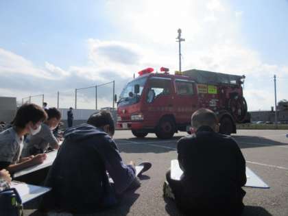 5年生 BFC活動 公開日 2020/10/29 更新日 2020/10/29 5年 倉垣消防団の分団のシャッターに描かれる消防車のスケッチ中です。みんな目の前の消防車をじっくりと観察しながら、描き始めています。