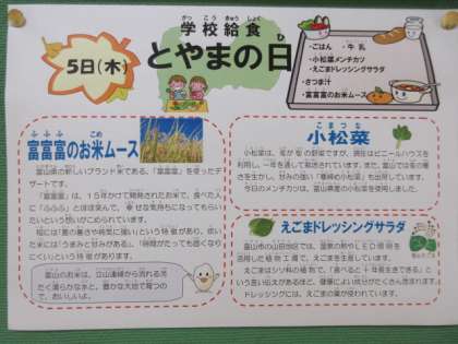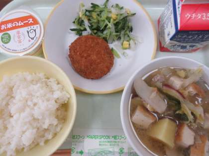 今日の給食(とやまの日) 公開日 2020/11/05 更新日 2020/11/05 学校から 小松菜メンチカツ えごまドレッシングサラダ さつま汁 富富富のお米ムース 富山県産の食材が使われたメニューです。