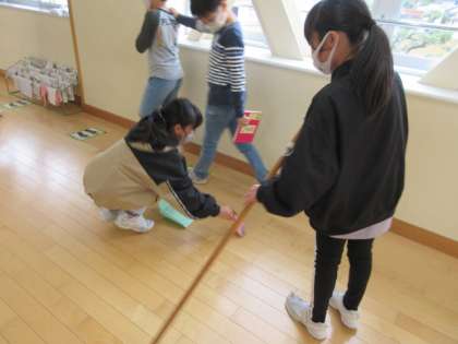掃除の後の昼休み。廊下にまだゴミが残っていることに気付いた5年生がきれいにしてくれています。