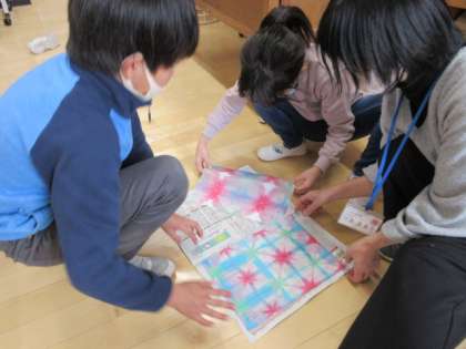 また、おりぞめ教室では、きれいに染めた作品をていねいに乾かす姿が見られます。