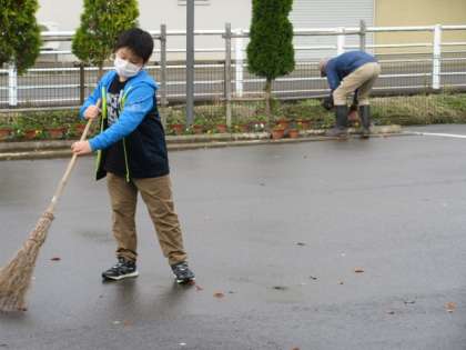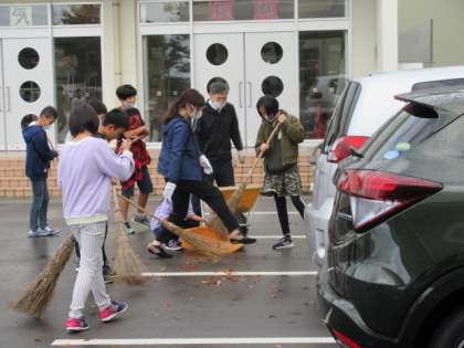 環境委員会の子供たちが、玄関前の花壇の苗の植え替えをしていました。パンジーとビオラのきれいな花をぜひ見てください。いつもは用務員さんにきれいにしてもらっている落ち葉をはき、集めています。