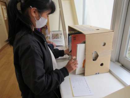 図書委員会の子供たちが、「おすすめの本・スタンプラリー」のチェックとはんこ押しをしています。
