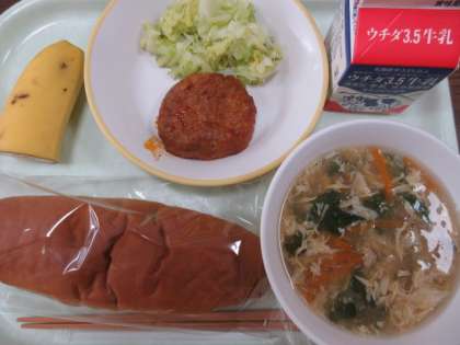 今日の給食 公開日 2020/11/10 更新日 2020/11/10 給食室から 子供たちに人気のハンバーグ。今日はケチャップ味です。 黒糖コッペパン かき玉スープ ゆでキャベツ バナナ と今日も栄養たっぷりで温かい給食に感謝。