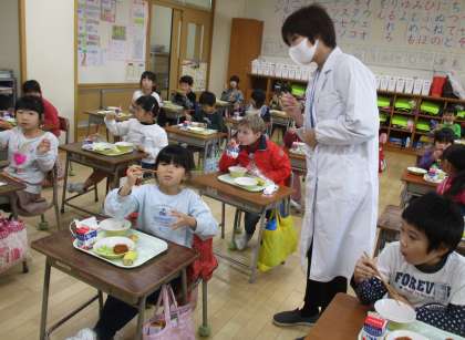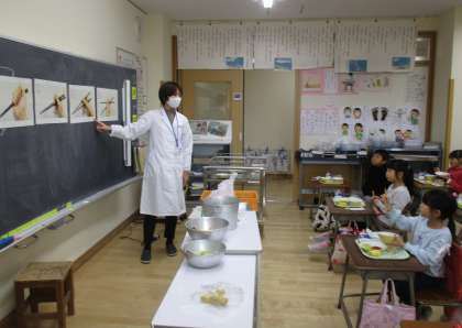 給食の時間に、学校栄養職員の方にはしの持ち方を教えてもらいました。1本のはしを鉛筆の持ち方で持ってから、もう1本のはしをはさむ方法で教えてもらいました。なかなか難しいようでしたが、少しずつ正しく持てるようになるといいですね。