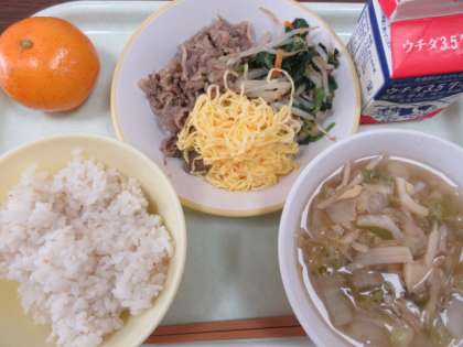 今日の給食 公開日 2020/11/19 更新日 2020/11/19 給食室から 麦ごはん ビビンバ(焼き肉、ナムル、錦糸卵) 春雨スープ みかん 給食室に届いた素敵な和牛肉は、ビビンバでいただきます。やわらかくて、とても美味しいです。提供していただいた方々に感謝して食べましょう。