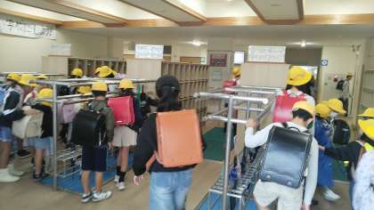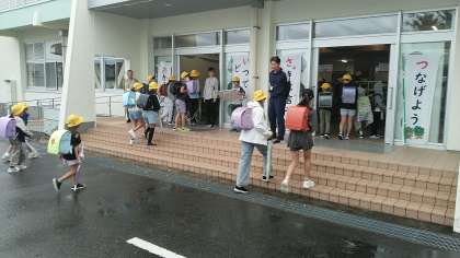 今朝の児童玄関の様子です。雨の日です。子供たちの挨拶は、大きな声の人が何人もいました。素晴らしいです。