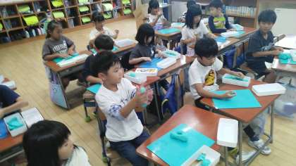 1年生の2時間目は、図画工作科の学習でした。粘土をひも状にして何かをつくる「ひもひものせかい」をつくっていました。