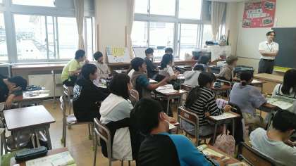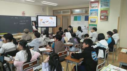 6年生の2時間目は、外国語科の学習でした。動画に出てきたBLTサンドイッチのBLTが何なのかをALTの先生に英語で質問していました。ベーコンレタストマトサンドイッチ。