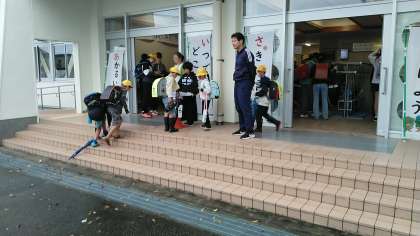 今朝の児童玄関の様子です。雨の日です。風もふいていて、寒いくらいです。元気な挨拶をしてくれる子供が何人もいました。
