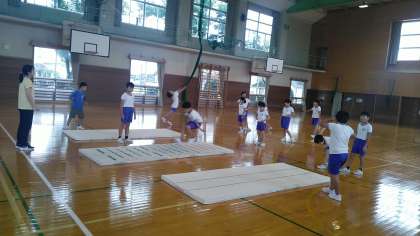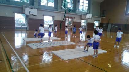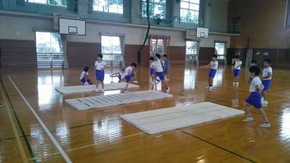 3年生の3時間目は、体育科の学習でした。マットの上でジャンプの練習をしていました。振り上げた腕に合わせて跳ぶ練習をしていました。