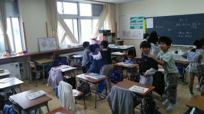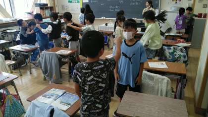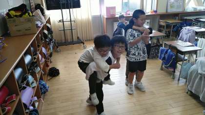 2年生の3時間目は、音楽科の学習でした。音楽に合わせて電車ごっこをしているみたいでした。