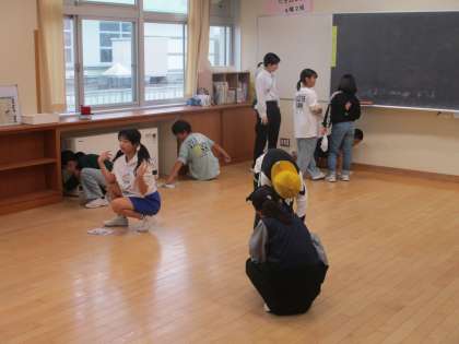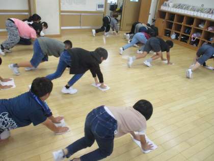 放課後のワックスがけに向けて大掃除をしました。教室の中を空にして、教室の床の汚れを雑巾で一生懸命に拭き取っていました。
