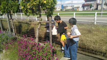 4年1組の3時間目は、理科の学習でした。外に出て、秋の生きものを探していました。