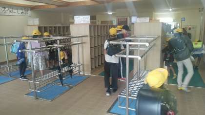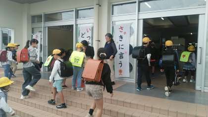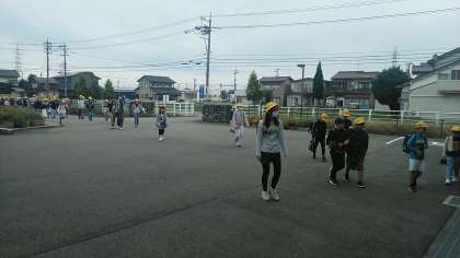 今朝の児童玄関の様子です。曇り空で肌寒い日です。挨拶は、元気です。
