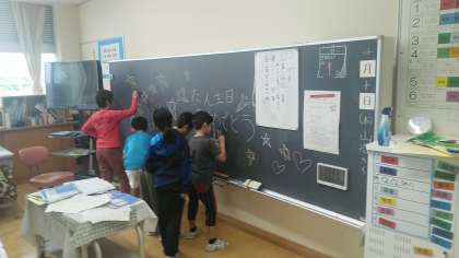 担任の先生のサプライズでお祝いしようとしている教室がありました。