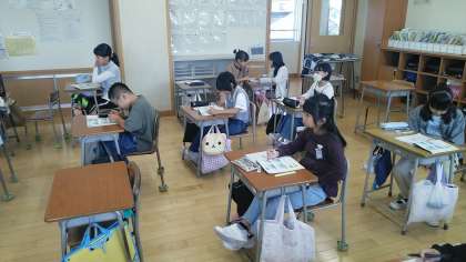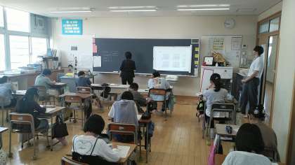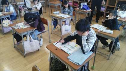 4年1組の1時間目は、外国語活動の時間でした。鉛筆や消しゴムがいくつあるかの英語の説明を聞いて、4つの筆箱の絵の中から正解の筆箱を選んでいました。