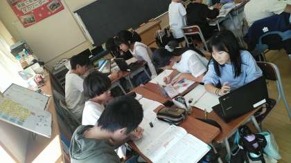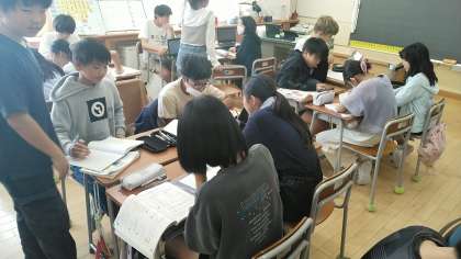 6年生の3時間目は、算数科の学習でした。グループごとにドットや度数分布表等について話し合っていました。