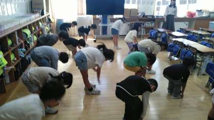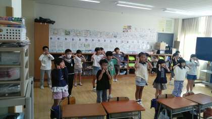 1年生の3時間目は、外国語活動の時間でした。「ヘッド ショルダー ニーザン トウズ ニーザン トウズ」と、歌って踊るのを楽しんでいました。