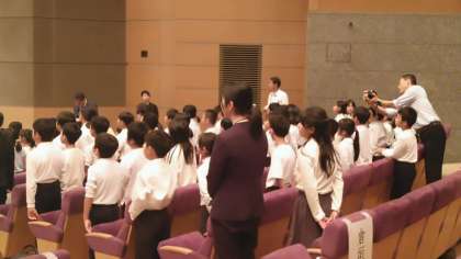 休憩の後、座席で全員合唱「こころが今日も笑顔」を歌いました。