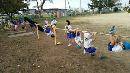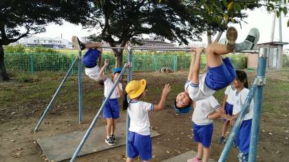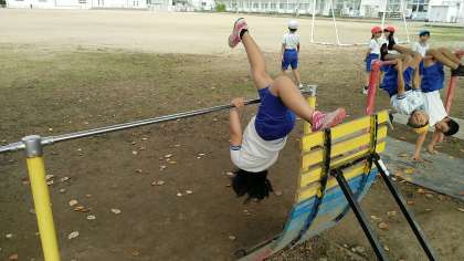 2年生の1時間目は、体育科の学習でした。グラウンドで鉄棒の学習をしていました。