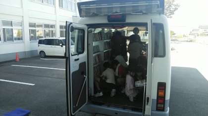 今日は、富山市立図書館の自動車文庫の日でした。写真は、4年1組の子供たちが本を返したり、選んだりしているところです。
