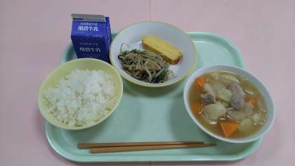 今日の給食です。 【献立】 ごはん 牛乳 厚焼き卵 チンゲンサイソテー ポトフ です。