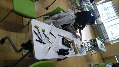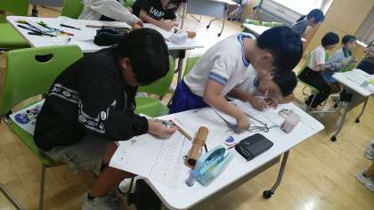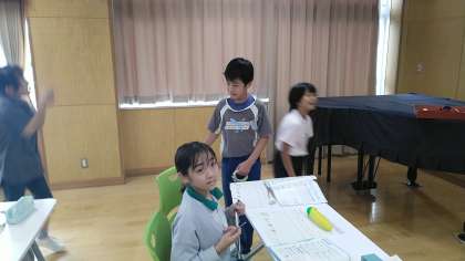 5年生の5時間目は、音楽科の学習でした。3人のグループごとに、リズムアンサンブルをつくっていました。