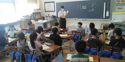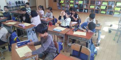 1年生の3時間目は、今度行く校外学習の話でした。しおりを確認しながら、魚津水族館やミラージュランドの話をしていました。