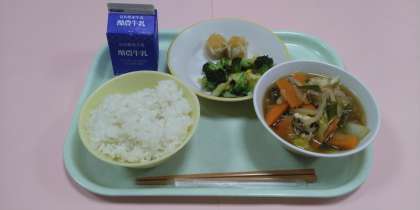今日の給食です。 【献立】 ごはん 牛乳 にんじんシューマイ コーン和え 豚すき焼き です。