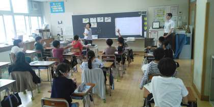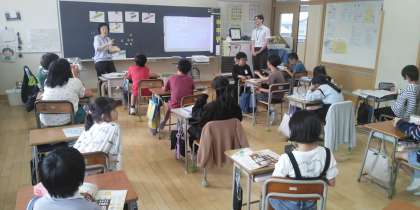 4年1組の5時間目は、外国語活動の時間でした。筆箱の中の文房具を英語で聞く練習をしていました。